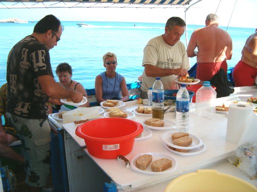 met een boot. De kapitein en zijn helper (playboy links) maken met droog brood een lekkere griekse salade. Tiki Tiki mit tzatziki |