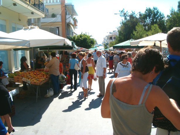 Zaterdag-markt in Ierapetra, met veel lekkere groenten en fruit, en uiteraard ook veel kleren. Hier kon zich monique een topje kopen voor 1 Euro.