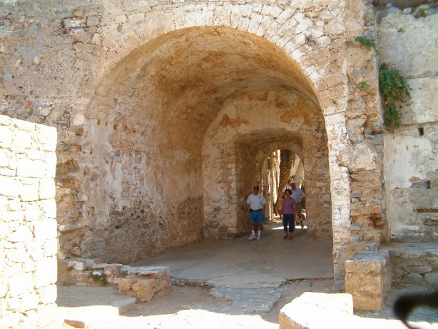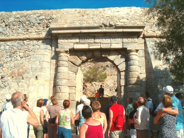 Door deze poort kwamen de melaatsen of leprosen het eiland binnen. Onze gids (de griek Dimitri) heeft ons laten verstaan dat het 'verbannen' van de melaatsen naar dit eiland, in tegenstelling tot de naam die het heeft gekregen, een weldaad is geweest voor die mensen. Zij hadden een uitkering, hadden vroeger elektriciteit dan de mensen buiten het eiland, werden er goed verzorgt en het belangrijkste van alles 'er waren geen gezonde mensen in de buurt die hun verachtten en verdreven'.