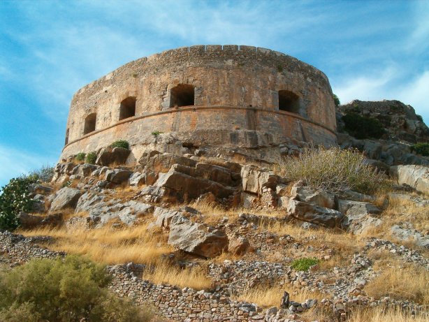 Dit is dan Spinalonga het melaatseneiland of ook wel lepra-eiland genoemd, kort bij het dorp Elounda. Dit dorpje had een jaar of 10 geleden nog maar enkele inwoners, er was toen nog maar juist elektriciteit. Toen heeft de Britse BBC een documentaire gemaakt over het dorpje, een slimme brit heeft hierop ingespeeld, zeer exclusieve hotels gebouwd, en nu is het al een trekpleister van het eiland. Echter alleen voor welvarende mensen, een kamer in een hotel kost hier minstens 500 euro per nacht per persoon.